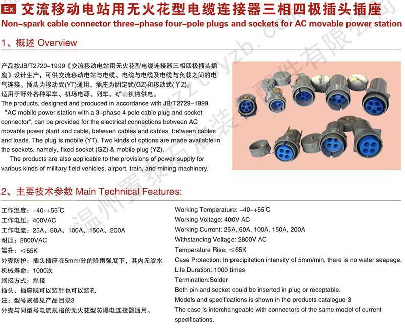 交流移動電站用無火花型電纜連接器三相四極插頭插座