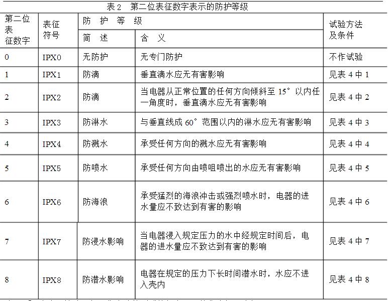 4.3 第二位表征數字的防護等級及其含義 第二位表征數字表示由于外殼進水而引起有害影響的防護,共分為9個等級,如表2。