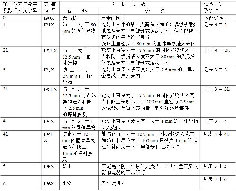 在表1中第一位表征數字及數后補充字母的相應防護等級從低級到高級排列依次為0、1、2L、3L、4L、3、4、5、6。凡符合某一防護等級的外殼意味著亦符合所有低于該防護等級的各級,除有懷疑外,不必再作較低防護等級的試驗。
